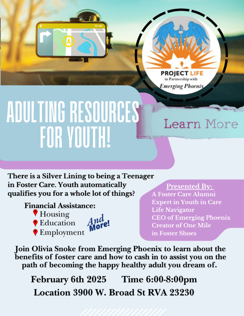 Project LIFE (Living Independently, Focusing on Empowerment) helps youth in Virginia succeed when they age out of foster care. We do that by helping youth directly and by supporting the professionals who work with them. Our free services are available to any youth ages 14-23 who has experienced the foster care system, as well as any DSS or private provider in Virginia.