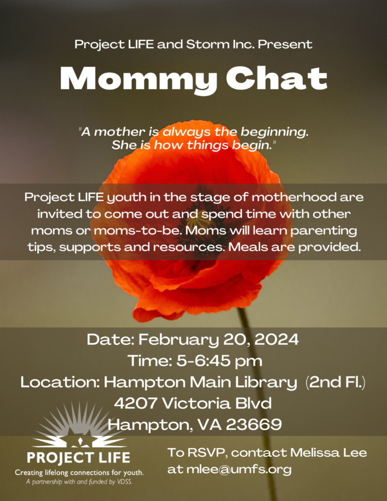 Project LIFE Joins VCU Medical Student-led Foster Care Initiative, whose mission is to improve the safety and health of children in the foster system in Richmond, VA. Project LIFE & VCU medical students will host a career-based workshop addressing interest in healthcare and medical fields. Register ASAP with tmurphy@umfs.org. February 22, 2024 @ 6pm to 8pm in the UMFS Campus auditorium.