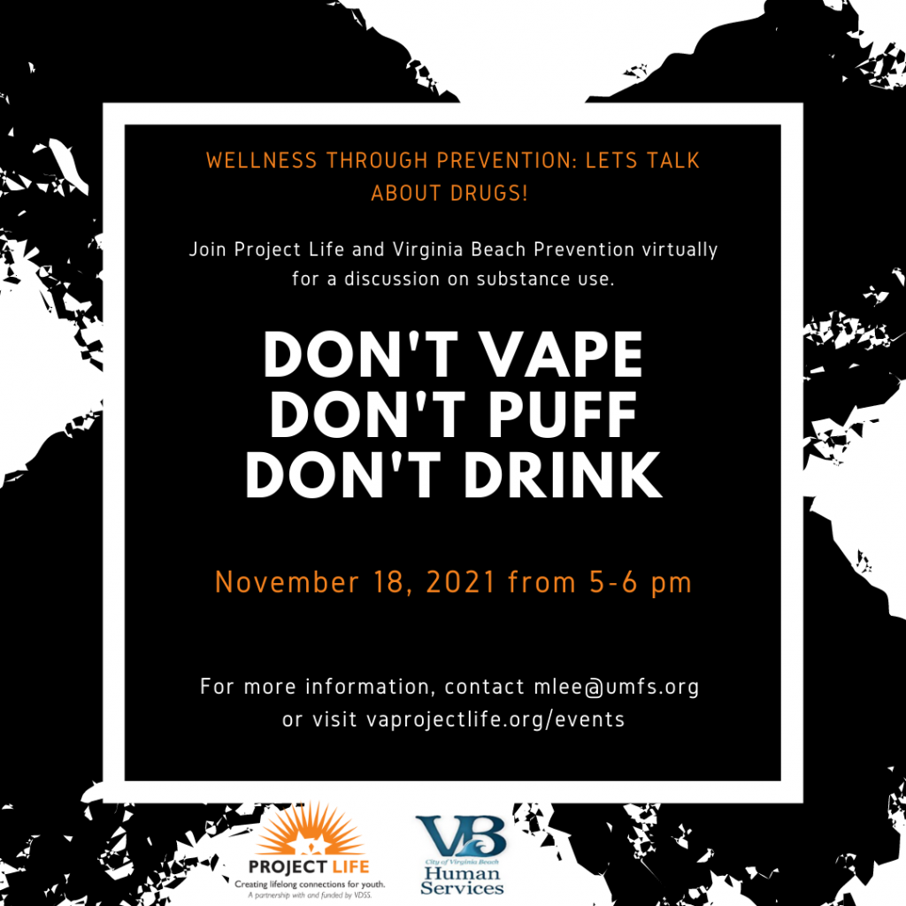 All Eastern region youth are invited to join Project Life and the Virginia Beach Department of Human Services Prevention office for an information session and discussion on vaping, using marijuana, and drinking alcohol. There will be a Q & A time as well. Register below if you plan on attending to get the link for this meeting. Not an Eastern youth but want to attend, or if you need more information, reach out to Melissa.