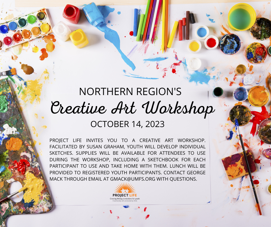 Project LIFE invites you to a creative art workshop. Facilitated by Susan Graham, youth will develop individual sketches. Supplies will be available for attendees to use during the workshop, including a sketchbook for each participant to use and take home with them. Lunch will be provided to registered youth participants. RSVP through the button below, and contact George Mack through email at gmack@umfs.org with questions.